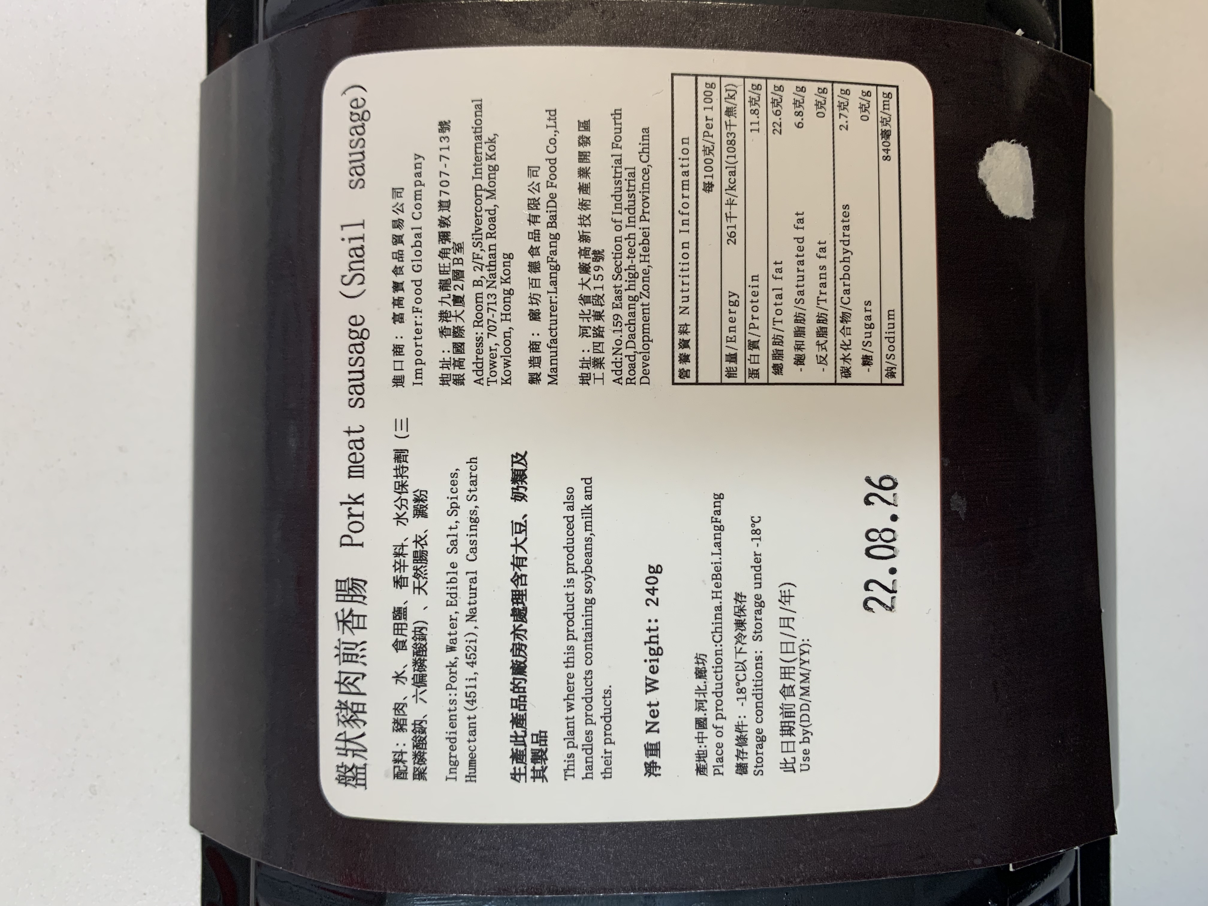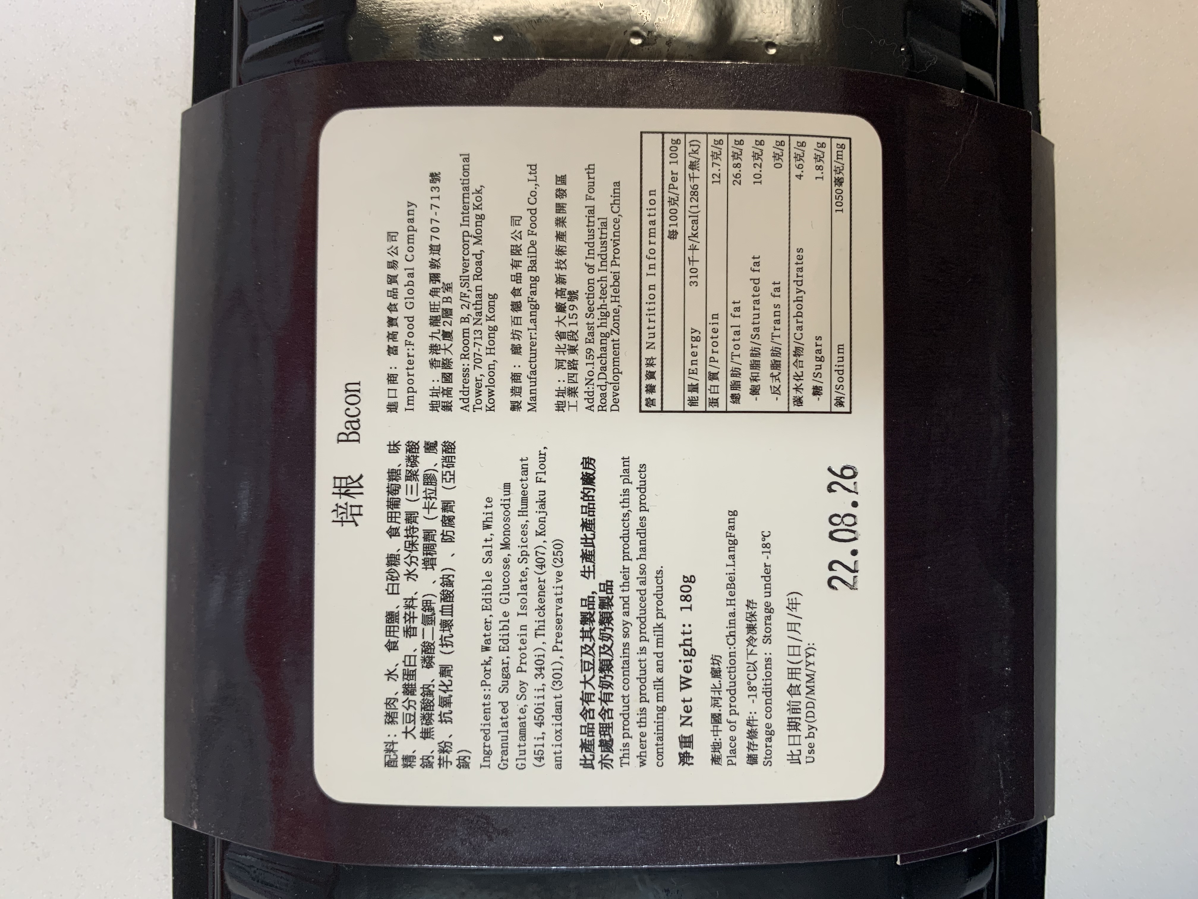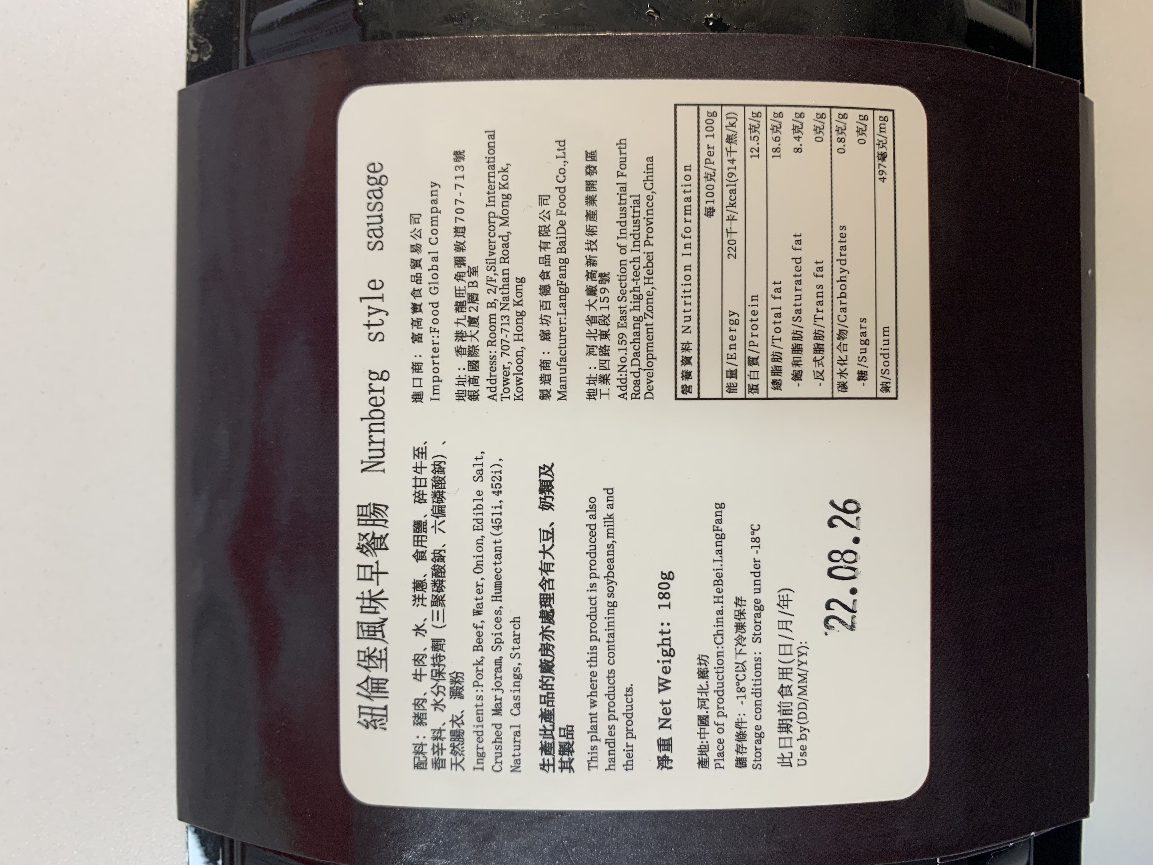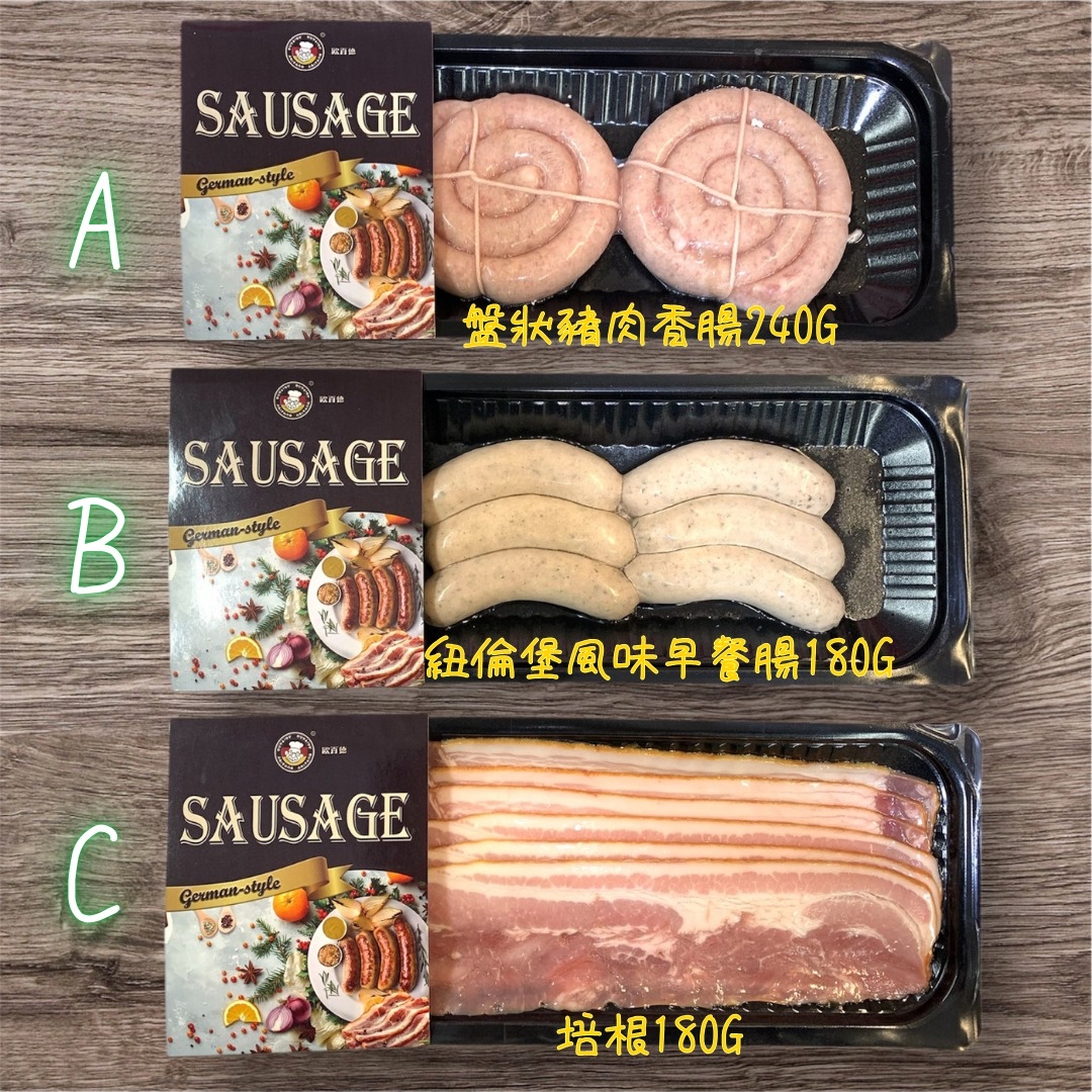 A. 盤狀豬肉香腸240G 成份:豬肉、水、食用鹽、香辛料、水份保持劑(三聚磷酸鈉、六偏磷酸鈉)、天然腸衣、澱粉。 EXP: 22.8.2026 B. 紐倫堡風味早餐腸180G 成份:豬肉、牛肉、水、洋䓤,食用鹽、碎甘牛至、香辛料、水份保持劑(三聚磷酸鈉、六偏磷酸鈉)、天然腸衣、澱粉。 EXP: 22.8.2026 C. 培根180G 成份:豬肉、水、食用鹽、白砂糖食用葡萄糖、味精、大豆分離蛋白、香辛料、水份保持劑(三聚磷酸鈉、焦磷酸鈉、磷酸二氫鉀)、增稠劑(卡拉膠)、魔芋粉、防腐劑等。 EXP: 22.8.2026