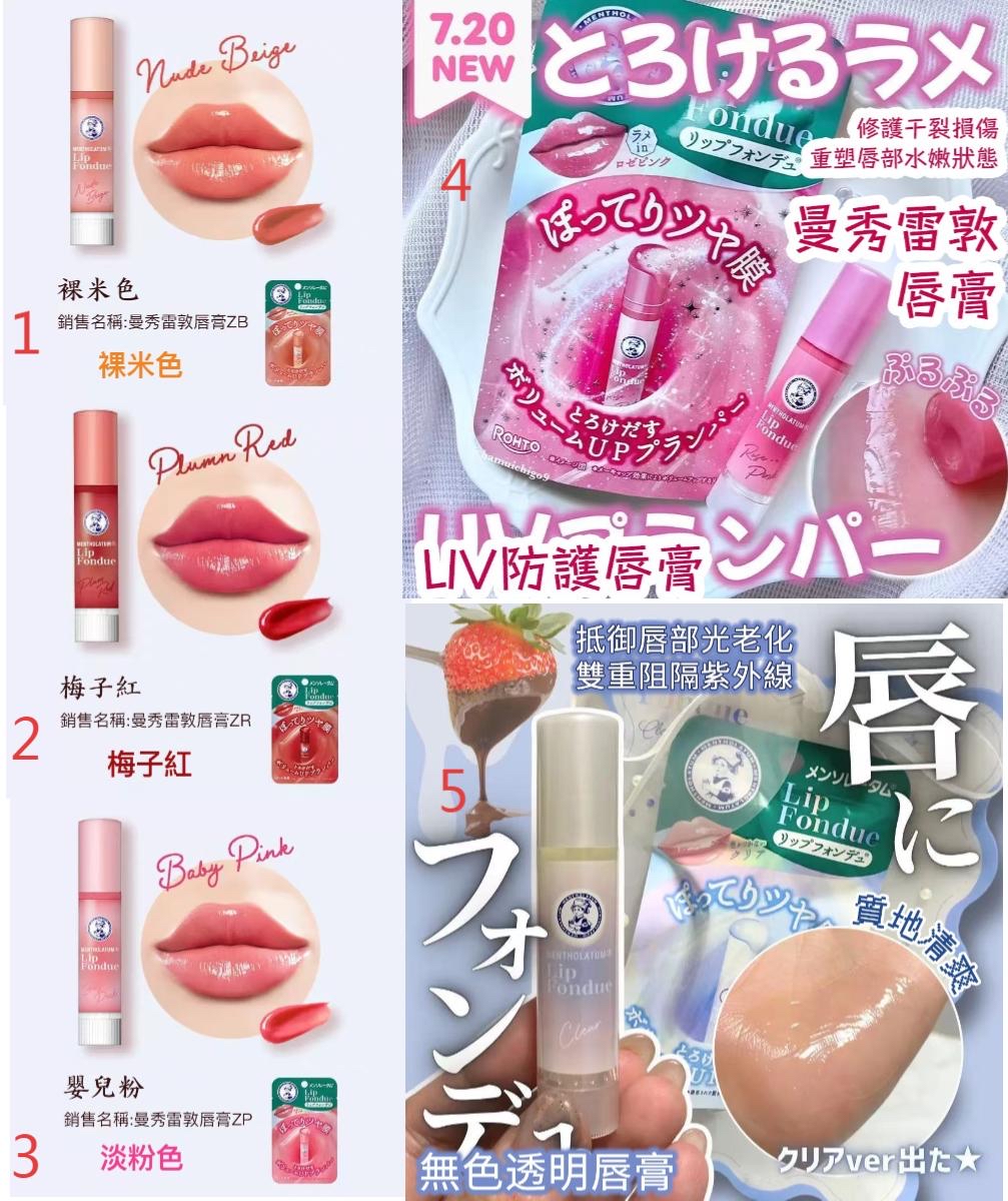 樂敦製藥 曼秀雷敦 LIP FONDUE 唇蜜 3.2G 有效期至: 2028年9月 1.裸米色 2.梅紅色 3.嬰兒粉色 4.玫瑰粉色 5.無色 23/12截單|預計11月尾到貨 同時具備唇膜和唇彩功效,內含豐富精華萃取,深入滋潤修護雙唇,亦可締造豐盈光澤唇妝。
