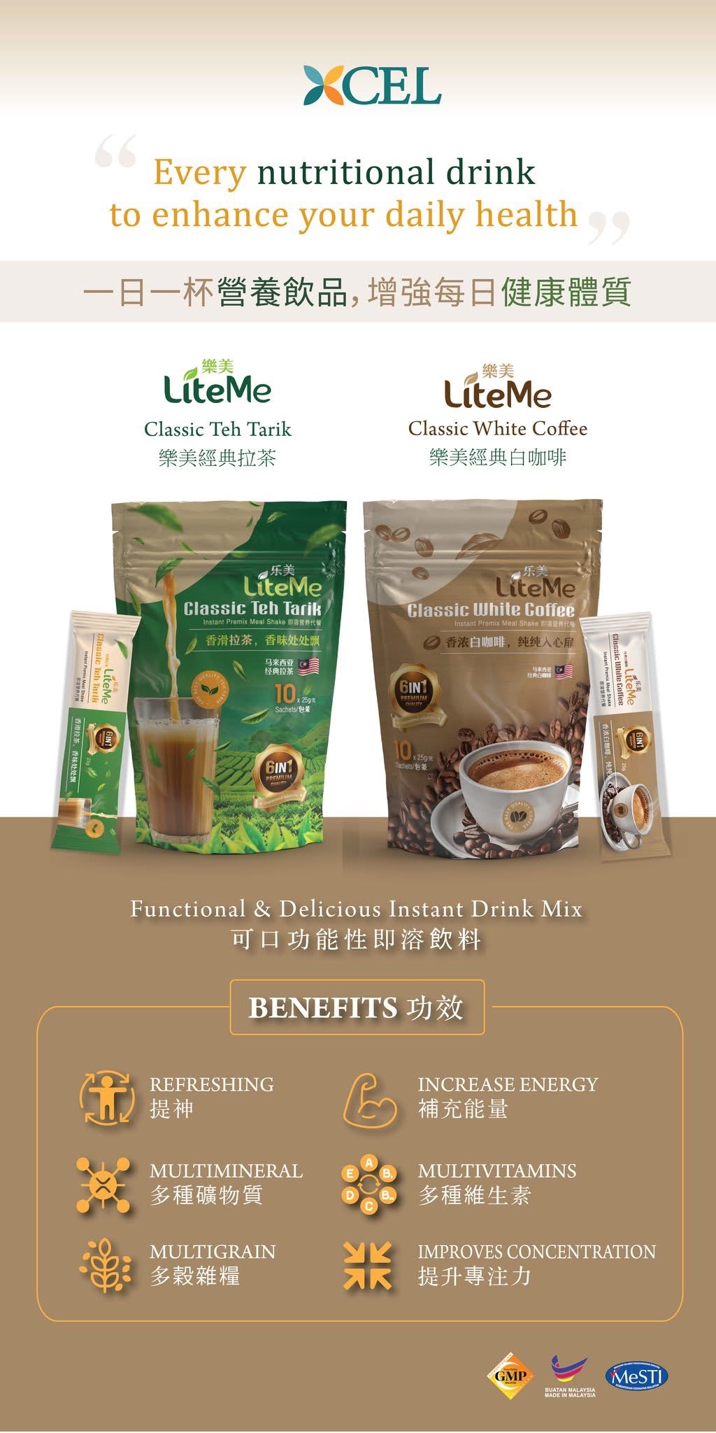 🇲🇾馬來西亞保健品公司XCEL🏅全新推出的Lite-Me 六合一馬來西亞香滑拉茶 / 馬來西亞經典白咖啡飲品🧋☕️由MCT脂質,多種維生素,多種礦物質,多種穀物,拉茶/咖啡,全脂奶粉🥛低聚果糖和甜葉菊🍯配製而成👍🏻 香味處處飄👃🏻純純入心扉❤️香濃可口,又有多重營養,每日一杯提神之外,飽肚又有益🫶🏻 而礦物質、維生素和含營養的穀物都對人體健康有很多益處💁🏻♀️ 🔸 礦物質: - 鈣、鐵、鉀等維持骨骼、肌肉和神經功能 - 鋅、銅、錳等參與酵素活動,促進代謝 - 碘有助於調節甲狀腺功能 🔸 維生素: - 維生素A有助視力、皮膚和免疫健康 - 維生素C是強大的抗氧化劑,增強免疫力 - 維生素D調節鈣磷代謝,維護骨骼健康 - B族維生素支持能量代謝和神經功能 🔸 多種營養穀物: - 全穀類如小麥、燕麥、糙米等富含纖維、蛋白質、礦物質和維生素 - 纖維有助消化,調節血糖和膽固醇水平 - 蛋白質維護肌肉組織,支持生長發育 - 維生素和礦物質提供廣泛的營養保護 適當攝取這些營養素不僅能滿足日常營養需求✅還可降低心血管疾病、糖尿病😷等慢性病的風險,對維護整體健康非常重要💪🏻 產品已獲多重國際認證許可,信心保證🫶🏻 ⚜️Certificate of GMP ⚜️Certificate of MeSTI ⚜️Halal Certificate ⚜️Certificate of HACCP 包裝:25g x 10小包 飲用方法:將150ml熱水加入,攪拌至溶解後即可飲用💁🏻♀️如要冷服用,可於溶解後加入冰塊🧊 最佳食用有效期:10/2025 (拉茶) 最佳食用有效期:10/2026 (白咖啡)