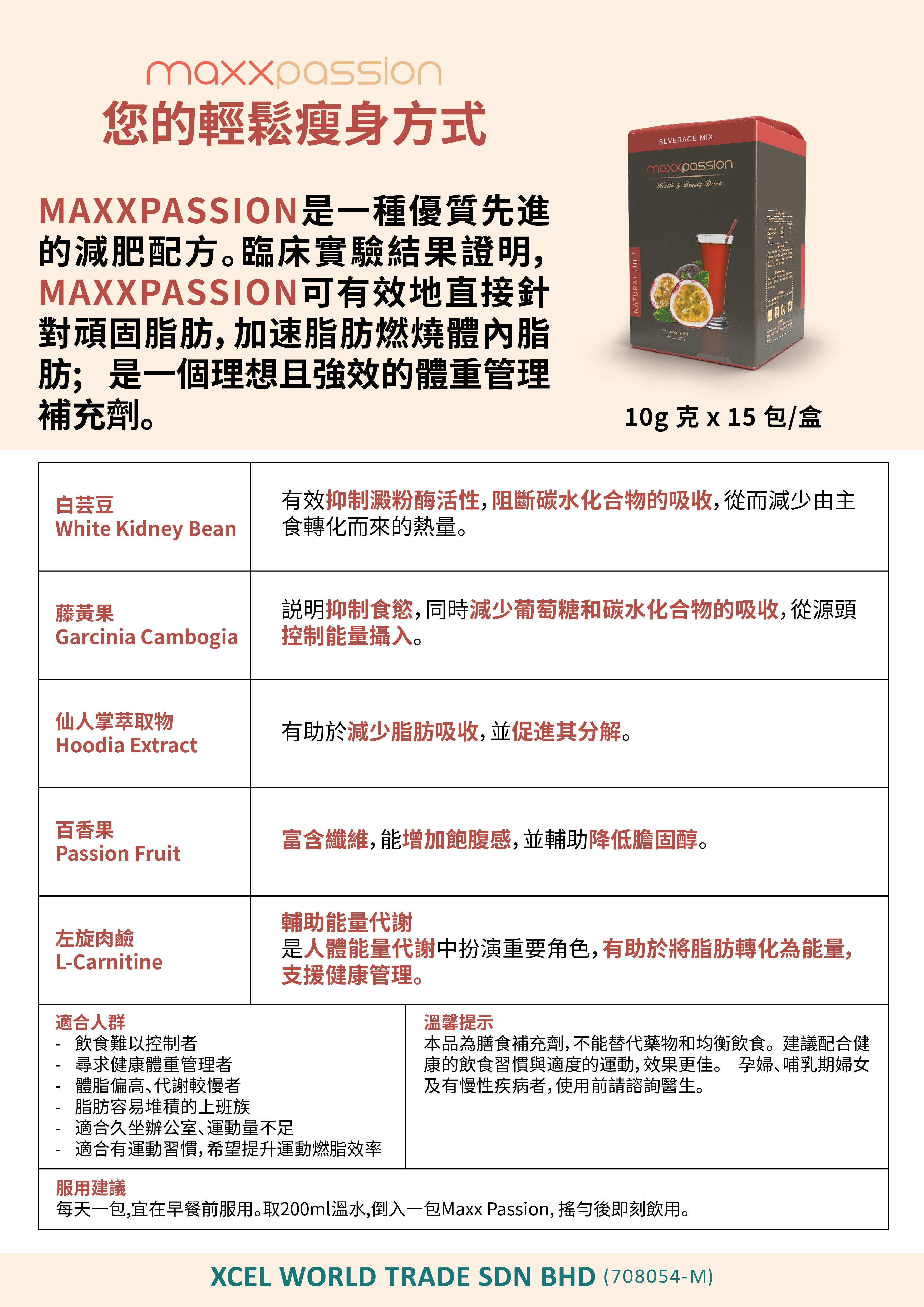 馬來西亞保健品公司XCEL🏅最新推出的減重產品maxx passion🍹採用了多種天然植物提取物☘能有效幫助人體燃脂減重,五大成分包括💁🏻‍♀ 1. 百香果提取物 - 含有豐富的維生素和纖維素,可以幫助身體清除自由基✅修復組織與細胞,以防止心臟疾病❤提高消化能力和清洗結腸👍🏻 2. L-肉碱 - 協助調節脂肪代謝,降低血液內與高膽固醇有關的脂肪🩸有助於減肥⭐改善血液循環不暢,有助於對抗冠狀動脈心臟疾病💕 3. 白芸豆 - 含有豐富的蛋白質和膳食纖維🈲阻止碳水化合物(澱粉質)被吸收到我們的身體🩻 4. 仙人掌提取物🌵 - 富含維生素E、B族維生素和多種礦物質🉑能夠有效調節腸道菌群,改善腸道功能,促進新陳代謝🌷它還具有抑制食慾,抑制脂肪合成的作用🤩 5. 藤黃果 - 有助於提高新陳代謝,減緩卡路里的攝入量⛔能夠抑制脂肪合成,增加熱量消耗,從而達到燃脂減重的作用💎同時它還具有調節血糖、降低膽固醇的功效😍 產品已獲多重國際認證許可,信心保證🫶🏻 ⚜Certificate of GMP ⚜Certificate of MeSTI ⚜Halal Certificate ⚜Certificate of HACCP 綜合上述多種天然植物提取物🌿通過調節代謝、抑制食慾、燃燒脂肪等多重機制,有助於快速有效地減輕體重🥳是一款非常不錯的減肥輔助產品🎁 包裝:10g x 15小包 飲用方法:200ml溫水加入maxx passion,搖勻後即可飲用 (建議每天早上於餐前服用,效果更佳) EXP: 08/2027