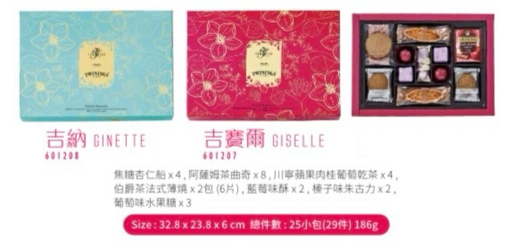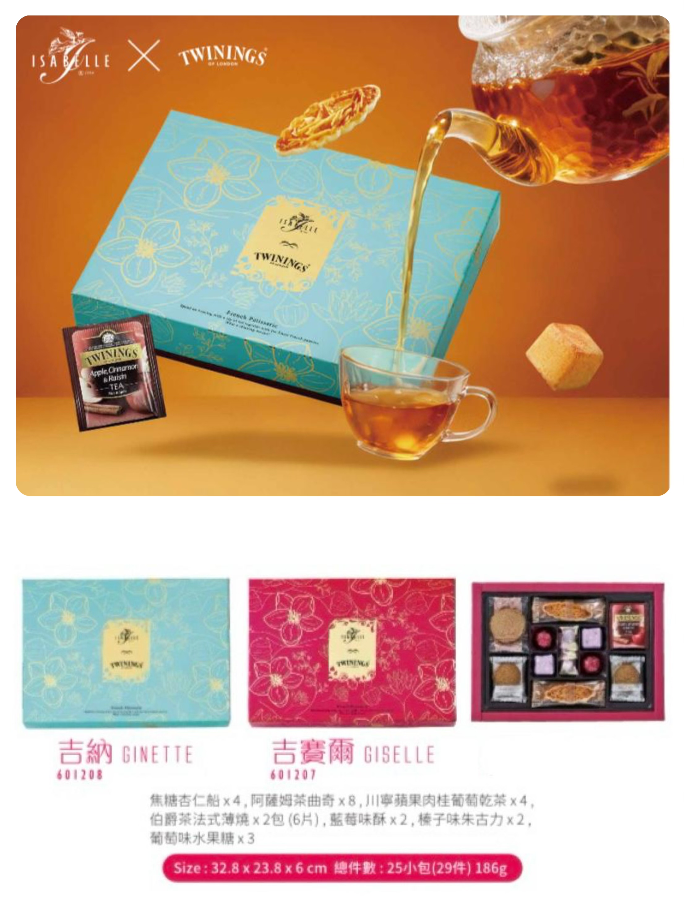601207 ISABELLE 吉賽爾曲奇禮盒 601208 ISABELLE 吉納曲奇禮盒 ISABELLE 與 TWININGS 携手合作推出 Crossover 曲奇茗茶禮盒。法式曲奇配以英式芳香茗茶,香濃牛油與清醇茶香完美交織,帶出最理想的味覺享受,加上輕奢華感的包裝設計,讓人愛不釋手的滋味驚喜! 禮盒內容:焦糖杏仁船 x 4, 阿薩姆茶曲奇 x 8, 伯爵茶法式薄燒 x 2 (6件) ,藍莓味酥 x 2, 榛子味朱古力 x 2, 葡萄味水果糖 x 3, 川寧蘋果肉桂葡萄乾茶 x 4 件數:25獨立小包 (29件) 尺寸:32.8 x 23.8 x 6 cm 重量:186g 圖片只供參考,請以實際物品為準。 -保存期限:生產起3-6個月(商品銷售速度快,依實際出廠為主。) -保存方式:避免陽光直射,請置於陰涼乾燥。 -過敏原資訊:本產品含麩質之穀物、牛奶、蛋、大豆及其製品,不適合其過敏體質食用。 ⭕️ 顏色或因拍攝器材或顯示螢幕等因素而與實物有異,以上圖片及文字僅供參考,一切以實物為準 ⭕️ 以上資料及外盒包裝只供參考,商品外盒原廠有更換新包裝權利,一切以實物為準。